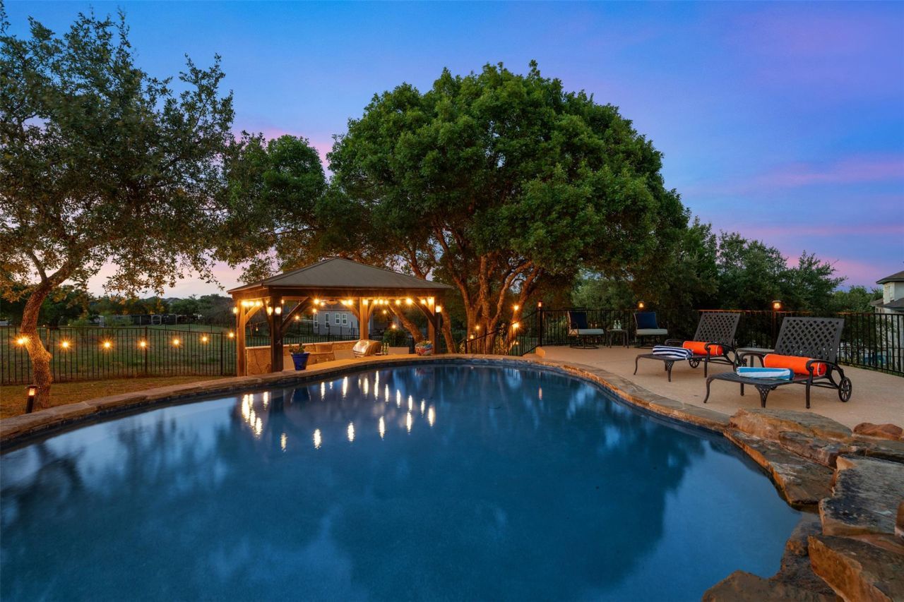 Welcome to 105 Cerro Picacho Trail a true Hill Country retreat nestled on a private acre in the highly sought-after Rancho Santa Fe community. Zoned to top-rated Liberty Hill ISD and built for both beauty and function, this 4 bedroom residence effortlessly blends elevated design with everyday comfort. From the moment you arrive, you're greeted by timeless stone architecture, mature trees, charming curb appeal and an extra wide iron front door. Step inside to find rich wood-look tile flooring, stunning exposed ceiling beams, floor-to-ceiling stone accents that set a warm yet sophisticated tone throughout and a dedicated office, spacious bedrooms plus a game room or additional flex space to make yours. The heart of the home is the chefs kitchen featuring custom cabinetry, granite countertops, a gas cooktop, double ovens, and an expansive island perfect for entertaining. An adjacent built-in desk space offers the ideal work-from-home setup, homework station or command station. The open-concept layout flows seamlessly into the spacious living and dining areas, where oversized windows showcase the serene backyard views and fill the space with natural light. Stone fireplace with hearth, gas logs and custom-built ins. The elegant primary suite is a tranquil haven, offering panoramic views of the backyard oasis, and a spa-like ensuite bath complete with dual vanities, a free-standing soaking tub, walk in shower and dual walk-in closets. Step outside to your personal paradise, an in-ground pool surrounded by lush landscaping and shaded by mature oaks. Whether hosting weekend gatherings or enjoying peaceful evenings under the stars, this backyard is ready to impress. Set off Hwy 183 with the expanded toll road, this home is an easy commute to Austin, Austin Bergstrom airport, Killen Airport, local grocers like HEB and the excitement of Costco and the largest Target coming to Liberty Hill! This home has it all, convivence, style, privacy, and the space to truly breathe.