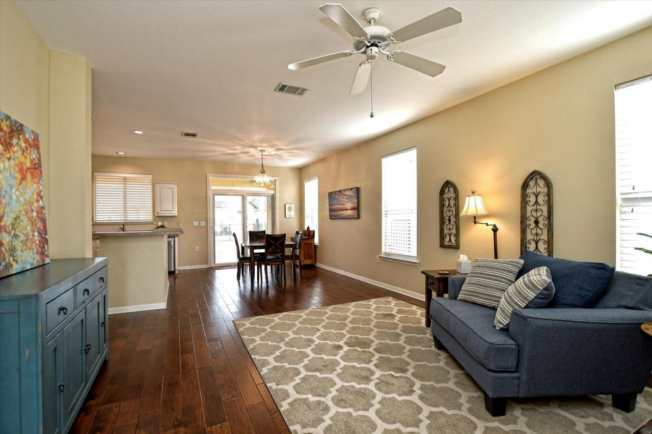 Well maintained home in the heart of Sun City, ready for move-in! This beautiful 2-bedroom, 2-bath residence features gorgeous engineered hardwood flooring throughout, with tile in both bathrooms. The open kitchen offers stainless steel appliances, a gas stove/oven, generous pantry space, composite countertops, and painted cabinetry?perfect for everyday living and entertaining.The spacious second bedroom or home office includes three large closetsclosets. The primary bedroom features charming bay windows, and both the primary and secondary bathrooms are equipped with handrails for added convenience. The guest bathroom has been updated with a granite countertop and new sink. Separate laundry room with shelves and closet.Relax or entertain on the large screened back porch, a peaceful retreat after a full day of activities. Located in the resort-style Sun City community, residents enjoy access to three golf courses, 27 tennis and pickleball courts, four activity centers, walking trails, clubs, and a full calendar of events. Visit sctexas.org for more details.Dont miss this charming home in an exceptional community!