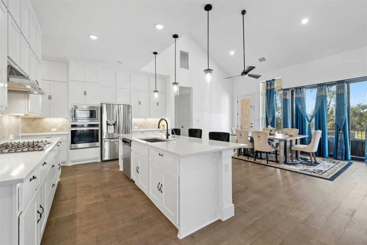 Discover the perfect blend of space, functionality, and style in this 5-bedroom, 4-bathroom home on a desirable corner lot spanning just over an acre in Liberty Hill. Designed for modern living, the open-concept layout features a soaring two-story living area with sliding glass doors that seamlessly connect to the expansive backyard. At the heart of the home, the chefs kitchen offers generous counter space, a walk-in pantry, and effortless flow into both the casual and formal dining areas. The main level also includes a private guest suite with a full bath, a dedicated study, and a well-appointed primary suite featuring a freestanding tub, a walk-in shower, and a walk-in closet with direct access to the laundry room for added convenience. Upstairs, three additional bedrooms, each with a walk-in closet, share two full bathrooms. A spacious game room overlooks the living area below, creating an open and connected feel throughout. With a three-car garage and a large covered patio, this home is designed for both comfort and entertaining. Zoned to Liberty Hill ISD and set in a serene location, it offers the ideal blend of privacy and convenience.