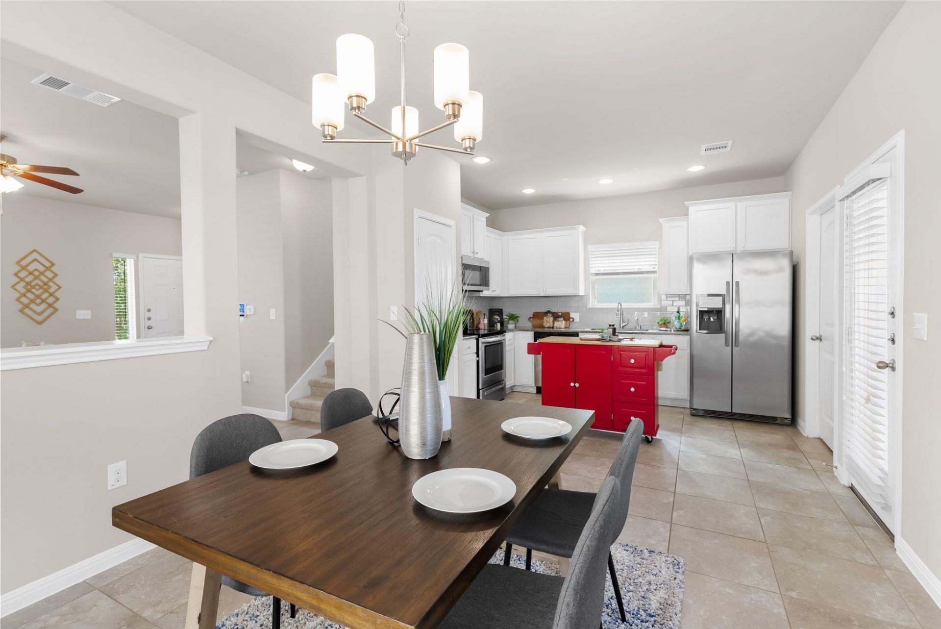 This THREE bed, TWO and a HALF BATH home with spacious FLEX Space constructed in 2017 blends classic front porch living with a fresh, modern edge and is sited in the amenity rich community of Highland Park. Inside, the main level offers a grounded, cozy feel that is relaxed, and easy to settle into. The kitchen keeps it clean and classic with GRANITE countertops and white cabinetry, opening to the living and dining areas so everything stays connected and functional. Tucked-away details like under-stair storage add a layer of practicality. Theres also a dedicated laundry room with utility sink and a well-placed powder bath on the main level for guests. Upstairs, the layout hits that sweet spot. A central landing offers room to thrive, while the primary suite with WALK-IN SHOWER, dual vanity and walk-in closet is set apart for a little breathing room. Two additional bedrooms have access to a hall bath. This floorplan wastes NO space and lives fully in its square footage. Positioned directly at the rear, the TWO CAR garage is thoughtfully placed keeping the front facade clean and inviting. The yard is LOW MAINTENANCE by design and has been extended with added fencing and pavers, creating more usable space for outdoor hangouts, while the private covered patio sets you up for shade, slow mornings, or winding down in the evenings. SOLAR PANELS add a smart, forward-thinking bonus, helping reduce energy costs while keeping things efficient. And the lifestyle? A rare balance of LOW HOA dues and high-impact amenities, residents enjoy a resort-style pool with lap lanes, basketball court, soccer field, playground, and miles of walking trails all thoughtfully maintained with green spaces and street lighting that makes the neighborhood feel active and connected. Grocery, dining, and everyday essentials are all within 10 minutes. Book your showing today!