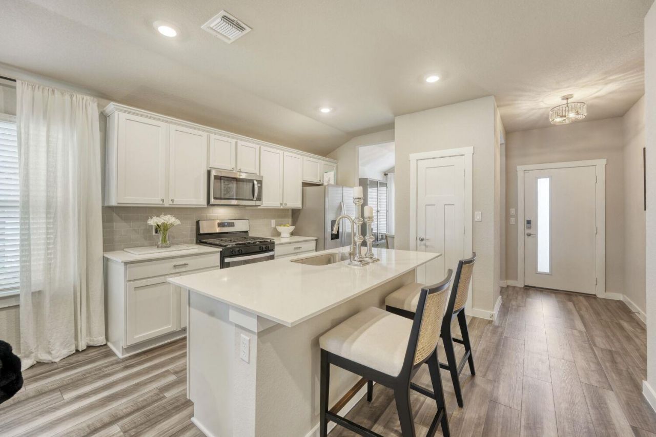 Experience 1300 square feet of pure coziness in this charming Georgetown home, featuring an open layout with recessed lighting and a neutral paint palette that highlights every space. The white kitchen is equipped with sleek cabinets, modern hardware, a breakfast bar, and a pantry, flowing seamlessly into a separate formal dining area perfect for gatherings. Bedrooms are carpeted for comfort, while low maintenance flooring runs throughout the common areas, creating a clean, inviting look. A nice-sized laundry room adds convenience, and the primary suite tucked at the back of the home offers dual sinks and a spacious shower with frameless glass for a serene retreat.Enjoy outdoor living with a landscaped, fenced backyard and a covered rear porch ideal for relaxing or entertaining. Located in the desirable Tres Tierras community, this home is minutes from local parks, top-rated schools, shopping, and a variety of dining options. With its thoughtful layout, stylish finishes, and prime location, this home combines comfort, convenience, and lifestyle appeal in the heart of Georgetown.Discounted rate options and no lender fee future refinancing may be available for qualified buyers of this home.