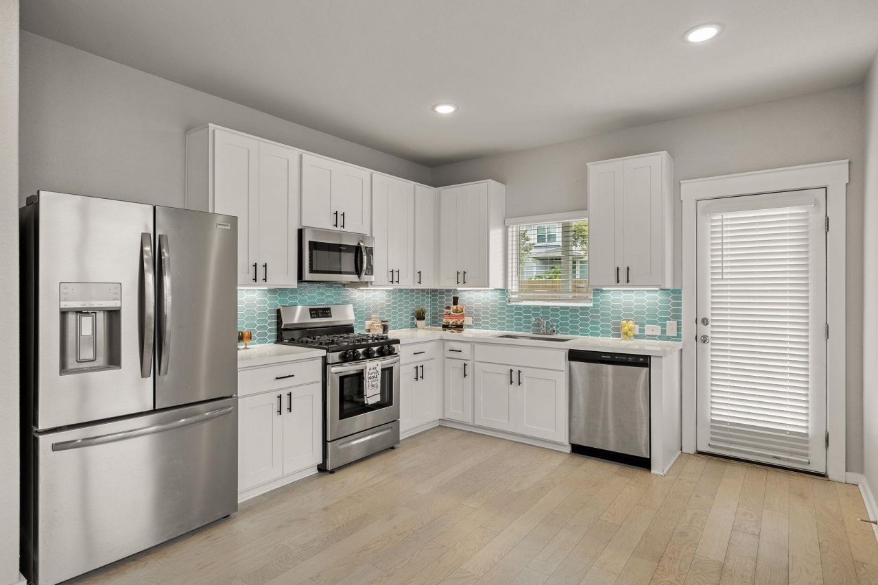 Welcome to this beautiful, bright, and airy two-story townhome, designed with a spacious and inviting layout that encourages entertainment and connection. The open-concept main level seamlessly connects the living space to the eat-in kitchen, where youll find pristine white cabinetry, a stylish backsplash, and sleek quartz countertops. Youll enjoy stainless steel appliances, including a gas range, and the direct access to the backyard for seamless grilling. Throughout the main level, recessed lighting and light wood-look flooring pair together beautifully, enhanced by abundant natural light streaming in through the expansive windows. The primary suite on the main level provides the fortunate new owners with a serene and private space, offering separation from the secondary bedrooms located upstairs. It includes an ensuite bathroom with an oversized walk-in shower, dual vanity, and a spacious walk-in closet. The second level offers a perfect retreat with three additional bedrooms, a full bathroom featuring a dual vanity, and a second living area. This versatile space can be utilized for relaxation, a game room, or a playroom, providing comfort and flexibility for everyone upstairs. This townhome is positioned with only one connected neighbor, ensuring privacy. Each backyard is enclosed with wood fencing, adding to the sense of seclusion. An additional feature is the pre-plumbing for a water softener loop, offering the option to enhance the home further if desired. Situated in a prime location within a friendly, tight-knit Homestead Townhome community, this home is within walking distance of Glenn High School and Danielson Middle School, and just 1.5 miles from Hisle Elementary. If you're looking for a home with a functional, versatile layout and a stunning, move-in ready aesthetic, this is the one for you!