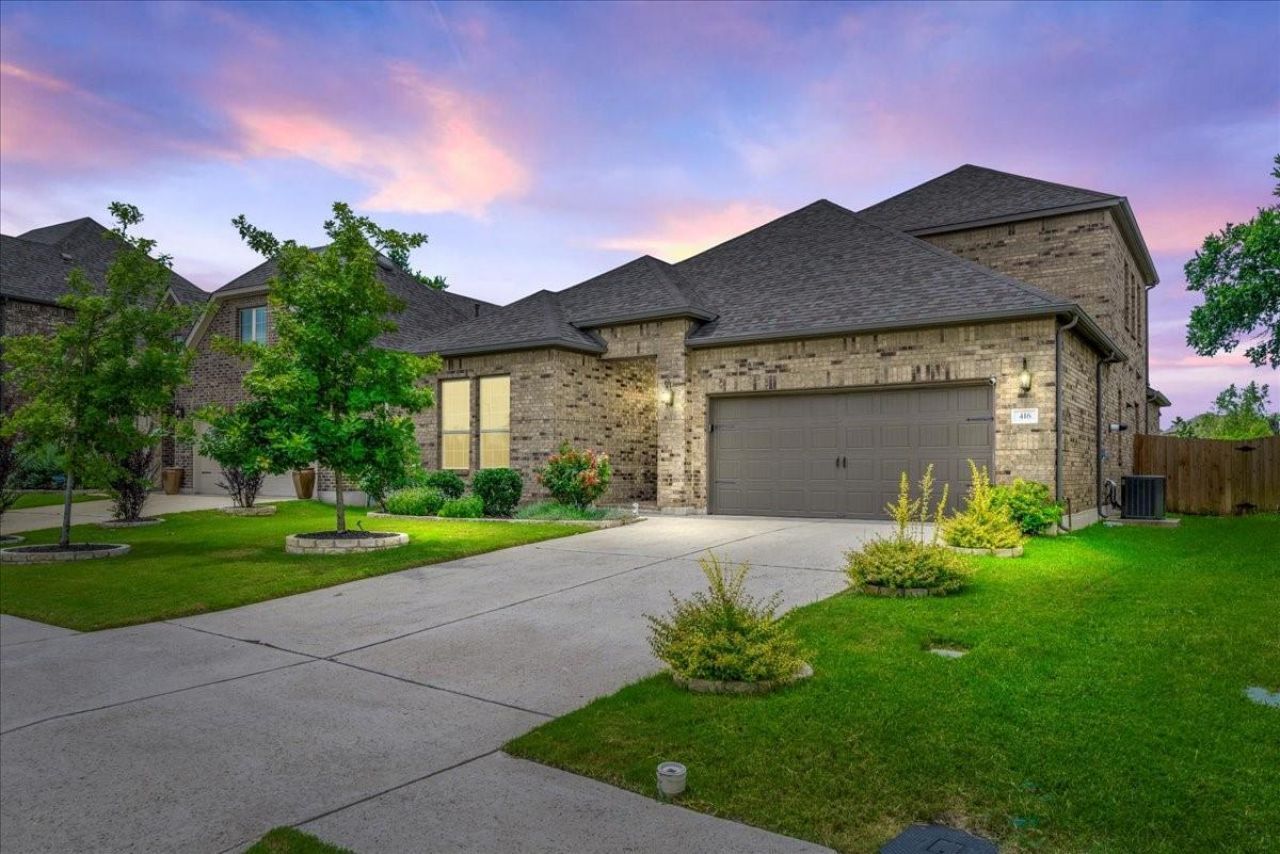 A lifestyle of relaxation awaits you at 416 Mistflower Springs Drive! This stunning home backs to a tranquil wooded green space, creating the perfect zen retreat. It's a nature lover's dream, featuring a wrought iron backyard fence that offers unobstructed views of the wooded areas, with native plants attracting birds, butterflies, and rabbits. Enjoy the spacious back patio, protected by a roll-down sun shade enclosure, or take a morning stroll on the scenic walking trail behind the home that rivals Central Park. This trail crosses North Brushy Creek and enters Benbrook Ranch park where you can enjoy a frisby disk course, playground, skate park, basketball and soccer fields. The home's interior offers an open-concept living, dining, and kitchen area, with large windows that frame the breathtaking backyard views. The owners suite is tucked at the rear of the home for ideal privacy with an envious spa-like bath. Relaxation abounds in the ensuite, featuring two vanities separated by a deep soaking tub. The oversized walk-in shower is enclosed by custom black framed glass with a bench seat, and the walk-in closet offers abundant storage. The main level includes two secondary bedrooms, while the second level offers a large bonus room, perfect for a secondary living area, game room, office, or playroom. To complete the homes amazing outdoor spaces, the garage is also equipped with a pull down shade, ideal for those who enjoy working on vehicles, DIY projects, or evening hangouts with friends and neighbors. The friendly community provides residents access to outdoor fun for all ages, including a relaxing pool, splash pad, playground, and walking trails. Located in a prime area with quick access to 183, numerous restaurants, and HEB just a short drive away within the neighborhood (no need to get on any road with heavy traffic or highway!) Come experience the serenity of 416 Mistflower Springs Drive today!