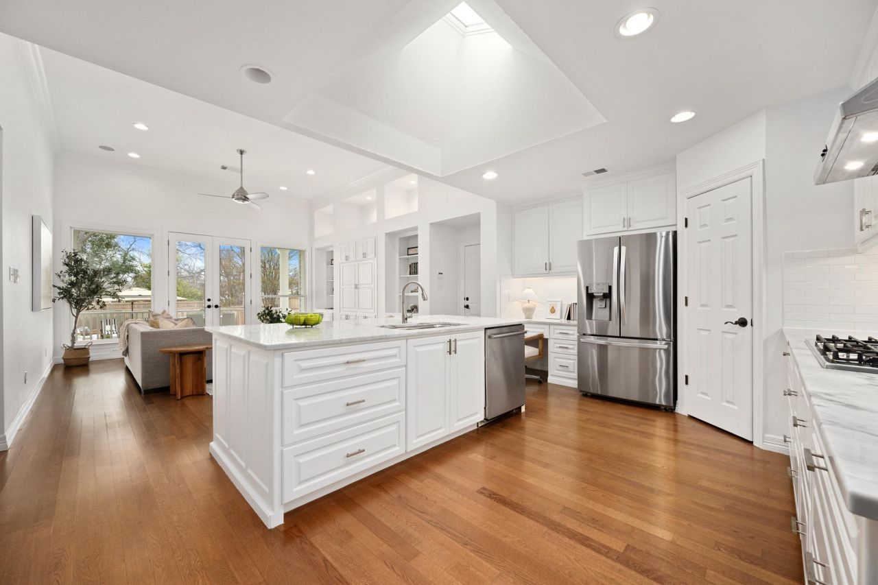 Tucked along a quiet internal street in the heart of Allandale, 5402 Shoalwood offers the rare balance of neighborhood tranquility and central Austin convenience. Because the street sits fully within the neighborhood rather than serving as a pass-through, it enjoys a calmer residential feel that is increasingly rare in such a prime location. Inside, the home unfolds with timeless elegance and an inviting flow. A welcoming front living room connects to a dedicated office, ideal for working from home or creative pursuits. Toward the back of the home, the layout opens into the main living area where the gourmet kitchen flows seamlessly into the family room, highlighted by vaulted ceilings and a dramatic wall of windows that flood the space with natural light and create a bright gathering space. The home offers three bedrooms plus the dedicated office, along with two full bathrooms and one half bath. The primary suite is especially striking, highlighted by an extraordinary bathroom remodel with soaring ceilings and beautiful high-end finishes that create a spa-like retreat. Outdoor living is equally compelling. A large covered back porch overlooks a beautifully landscaped backyard centered around a gorgeous pool and enclosed by privacy fencing, creating a setting that feels private and peaceful. Recent improvements include fresh interior and exterior paint as well as a garage finished with new epoxy flooring. From your front door, an easy stroll leads to neighborhood favorites like Fonda San Miguel, where the stunning bar and lush interior courtyard create one of Austins best happy hours, and where the legendary Sunday buffet has long been regarded as the finest in the city. Coffee shops, casual dining spots, and beloved neighborhood gathering places are all within easy reach. With its quiet internal street, inviting living spaces, and backyard retreat, 5402 Shoalwood captures the very best of Allandale living in one of Austins most loved central neighborhoods.