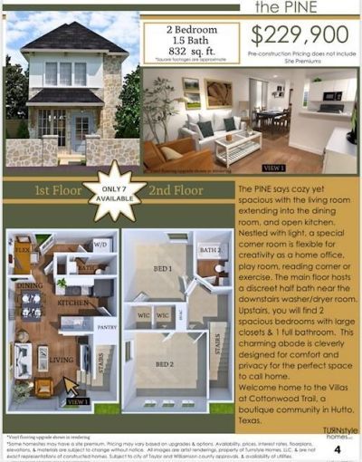 Brand New Stand-Alone Condos Under $300K! Discover the Villas at Cottonwood Trail in Hutto, TX ? a charming boutique community offering only 22 site-built homes starting from just $229,900, minutes from Austin, Tesla, Samsung, top schools, shopping, dining, and major highways for an easy commute. These beautifully designed stand-alone condos give you the privacy of a single-family home at unheard-of pricing in one of the fastest-growing areas in Central Texas! Each home comes with a private fenced yard, exclusive parking, low-maintenance native landscaping, and access to miles of scenic hike & bike trails connecting directly to Cottonwood Trail, Fritz Park, playgrounds, splash pads, athletic fields, and more ? perfect for enjoying the outdoors and an active lifestyle.Choose from 3 thoughtful floor plans: the cozy Pine 2 bed/1.5 bath (starting at $229,900), the bright and modern Juniper 3 bed/2 bath (from $249,900), and the spacious Spruce 3 bed/2.5 bath (starting at $279,900) with flexible spaces perfect for home offices, playrooms, or reading nooks. These new homes bring natural light, elegant exteriors, and comfortable layouts designed to enhance everyday living. For buyers seeking a personal home, this is a rare opportunity to own a brand new stand-alone condo under $300K ? pricing you simply wont find elsewhere in the Austin metro area!Investors will appreciate the excellent rental potential with estimated long-term rents of $1,500?$1,900/month per unit, along with the flexibility for mid-term and short-term rentals (Airbnb, Vrbo, Booking.com) for potentially higher returns, supported by strong rental demand driven by the nearby tech corridor, employers, and rapid area growth. Dont miss your chance to own a new home or investment property in a boutique community where lifestyle, affordability, and convenience meet. Site premiums may apply. Buyer to verify all information and numbers.